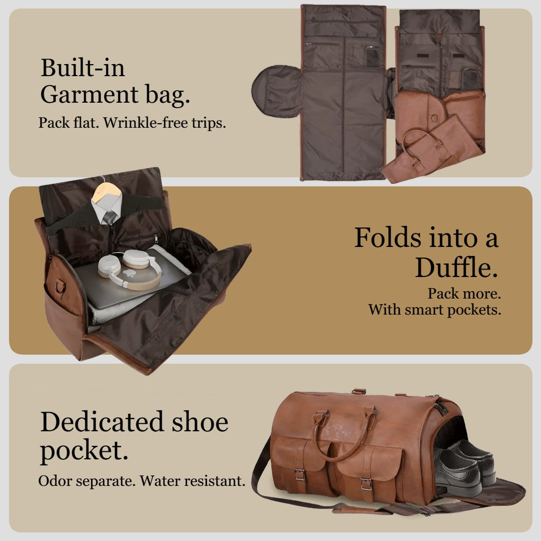 DuffleFold is built to replace three bags at once: your suitcase, your garment bag, and your weekender. Where standard duffles turn into a pile of wrinkled clothes and classic suitcases lack smart organization and style.
