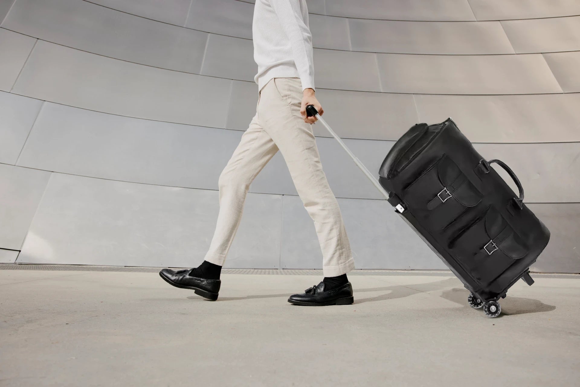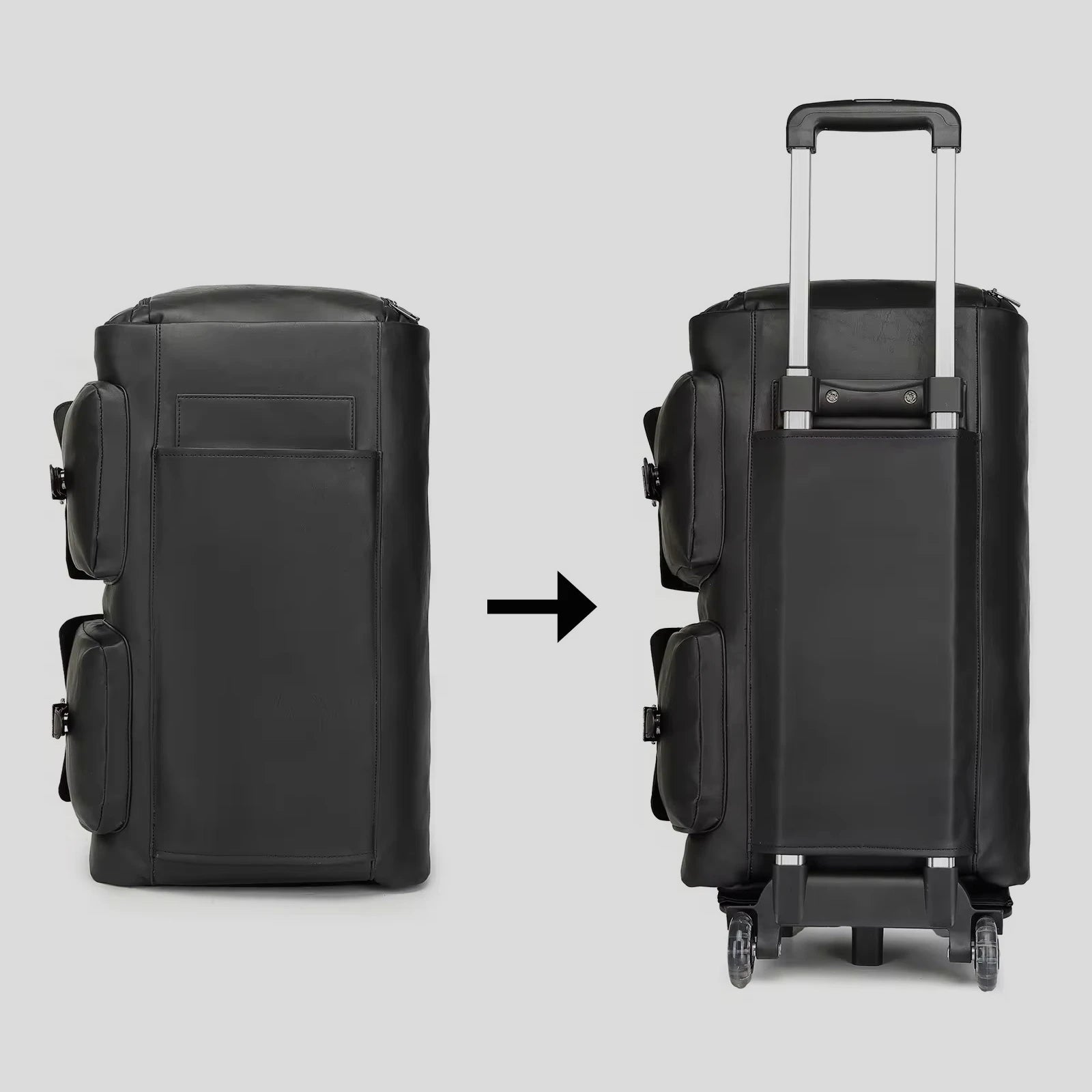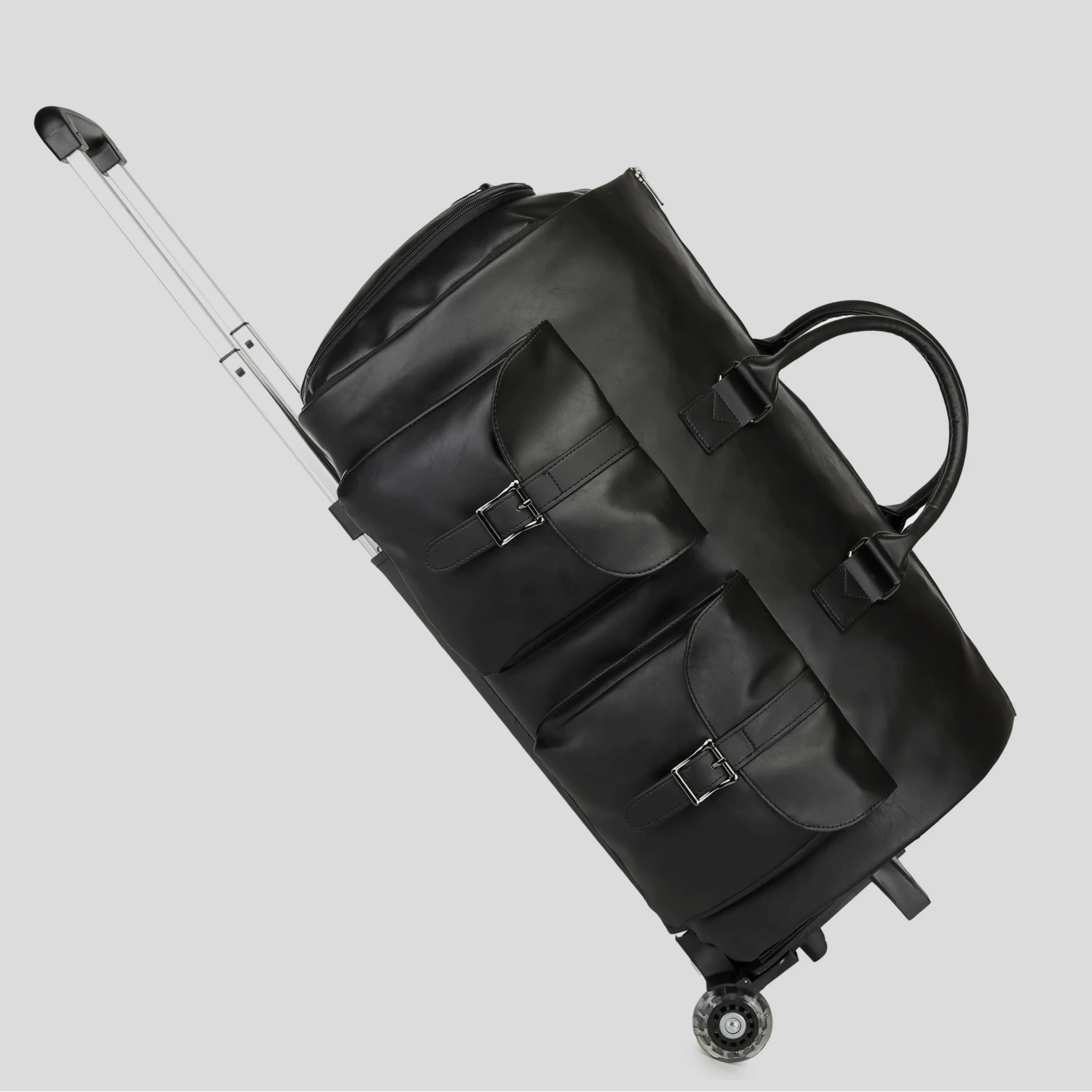 Turn heavy hauls into joyful rolls with our wheeled leather duffle – conquering cities, airports, and suitcase struggles with a wink of convenience and a dash of style!